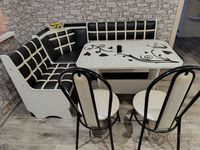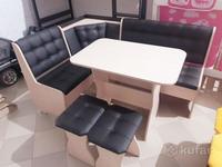 Набор мебели из кухонного стола, угловой скамьи и двух табуретов.