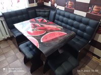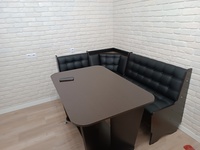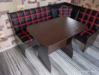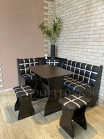 Обивка угловой скамьи и сидений табуретов выполнена из экокожи.