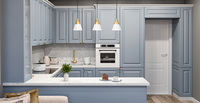 Лаконичная классическая кухня небесно-голубого оттенка с круглыми золотистыми ручками.