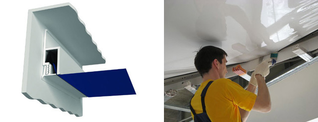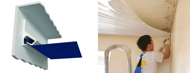 Как правило, штапиковый способ используется для установки ровного бесшовного потолка. Полотно для штапикового способа берется с небольшим запасом, превышающим на несколько десятков сантиметров общую площадь потолка. Затем по периметру стен устанавливается металлический профиль (багет). После установки багета в него закрепляется полотно с помощью штапиков.