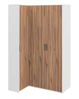 Угловой распашной шкаф с закрытыми полками и штангой для одежды.