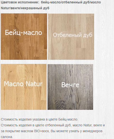 Тип покрытия — масло BIO, масло BIO+воск (обладает дополнительным водо — и грязеотталкивающим свойством, придает шелковисто-матовый блеск).