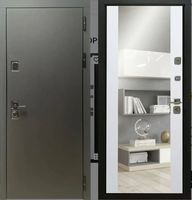Полуторная входная дверь с декоративной ковкой и вставкой из зеркала.